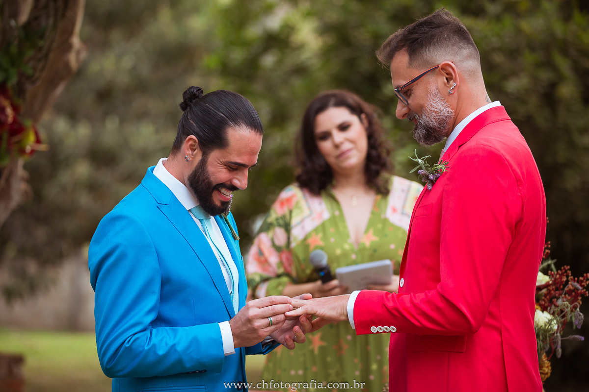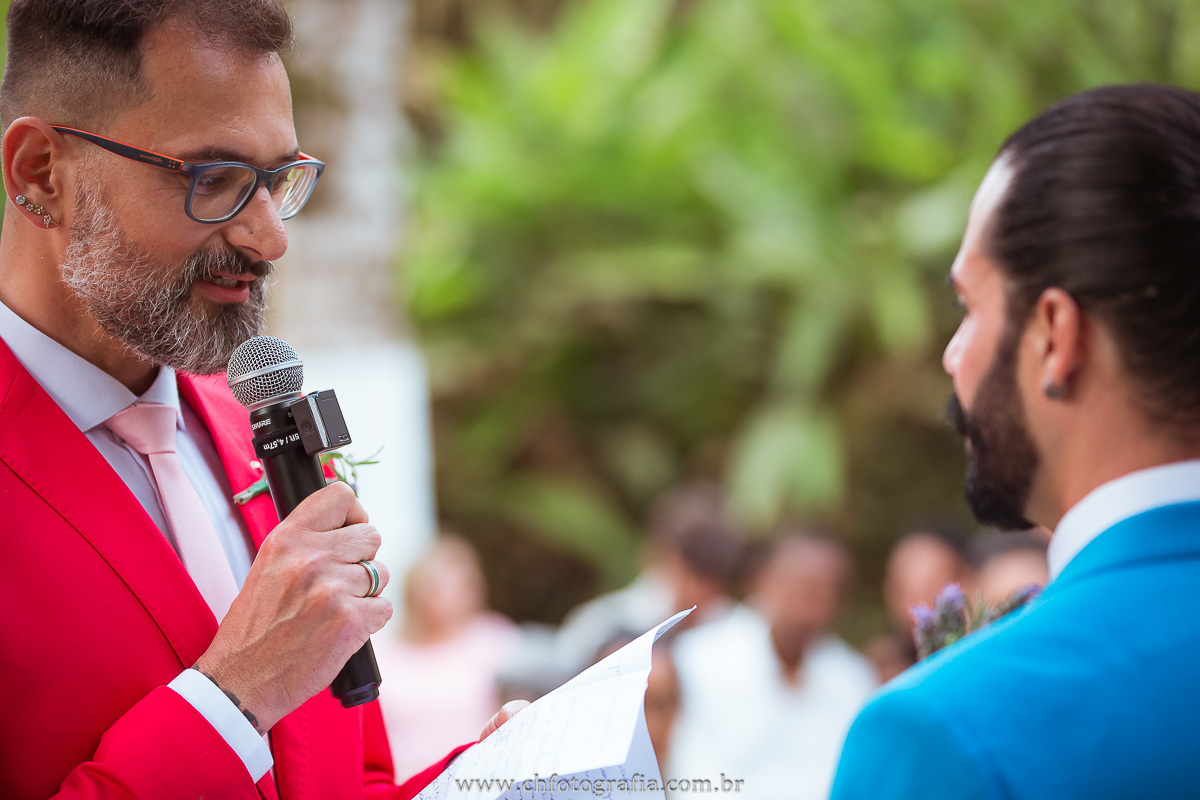Momento de cumplicidade e felicidade no casamento gay. O casal trocando votos de amor e compromisso.