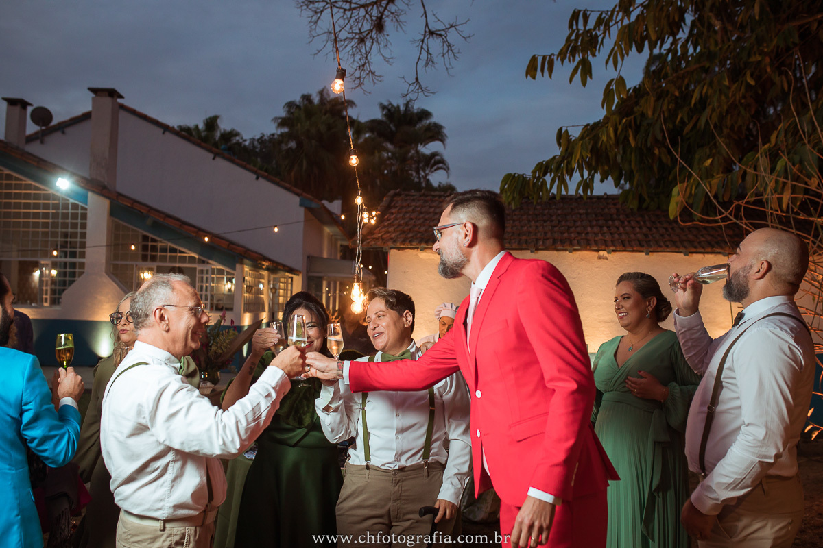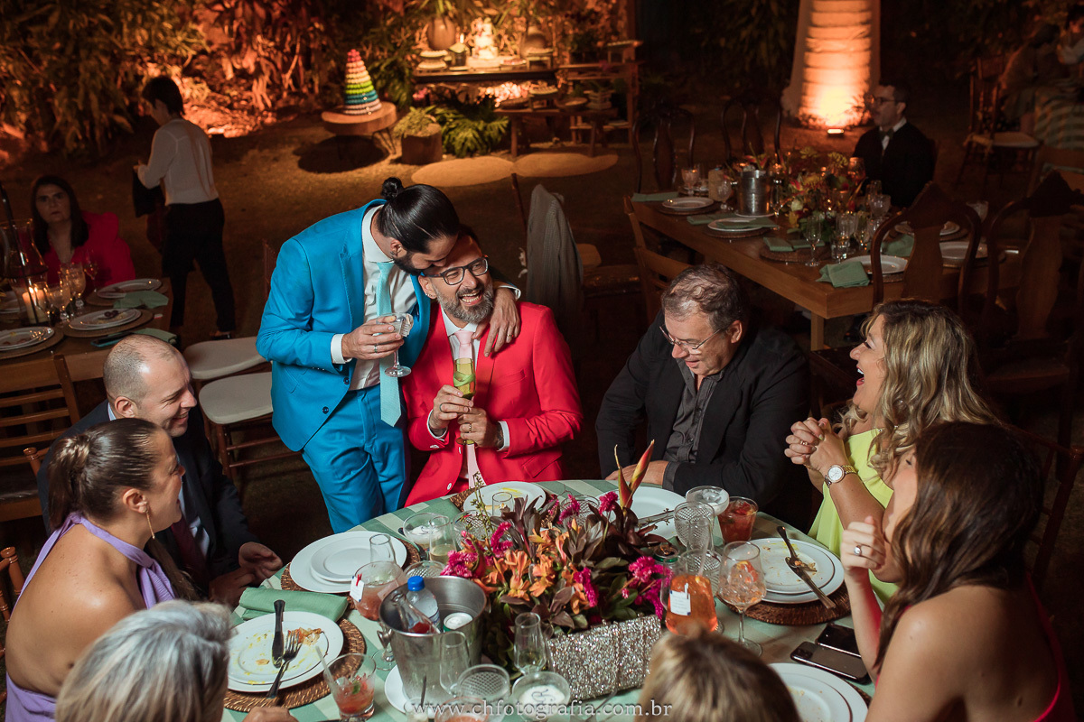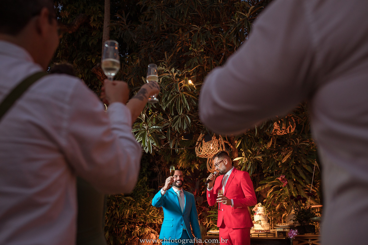 Ensaio thash the dress gay no chalé, noivos gay brindando, noivos gay comemorando